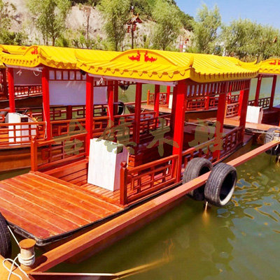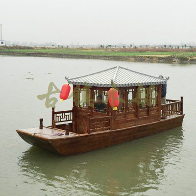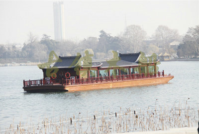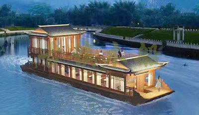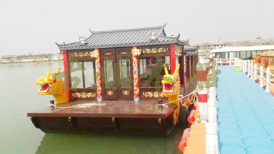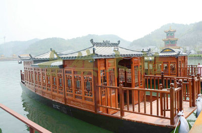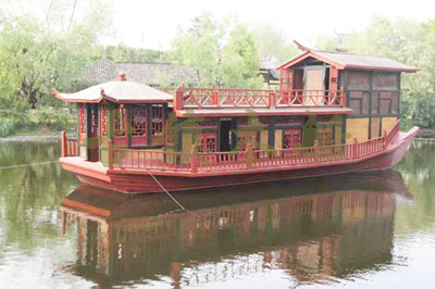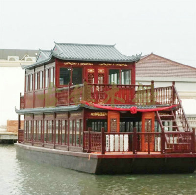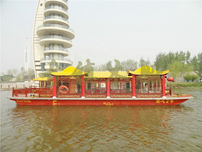 畫舫船就是裝飾古典華麗的游船,是"中國風(fēng)"的仿古游船,結(jié)合古典園林建筑,體現(xiàn)了中華文明的古典藝術(shù).畫舫船豪華而又古典,船上的建筑按照中國古代建筑里的亭臺樓閣,建筑工藝之復(fù)雜,要求之嚴格,仿古畫舫游船的特點飛檐翹角、玲瓏精致的四角亭子逐漸成形,赫然立于船頭,美人靠、盤龍柱子、彩畫……龍柱上的浮雕盤龍和祥云一層扣著一層,層層錯落有致,雕刻精細到盤龍身上的每一個鱗片都細細可數(shù),古代皇家標志性元素,在畫舫船上體現(xiàn)的淋漓盡致。除了雕刻、花窗,整條船還有一個看點,那就是弧線優(yōu)美、高高翹起的船尾。游船并不大,長約10米、寬3米,但是整體看起來堪稱一件藝術(shù)品。船尾的雕花欄桿與船艙、船頭的雕刻遙相呼應(yīng),船身四周貼著浮雕祥云,給整條船增添了富貴、華麗的氣質(zhì)。